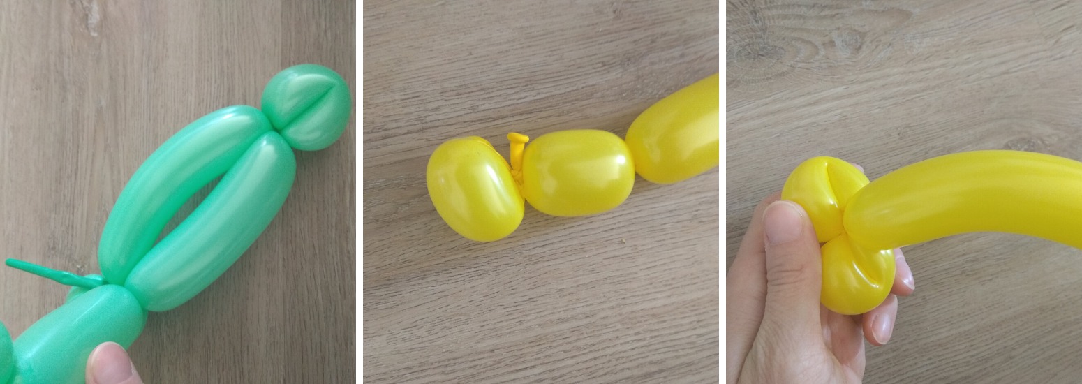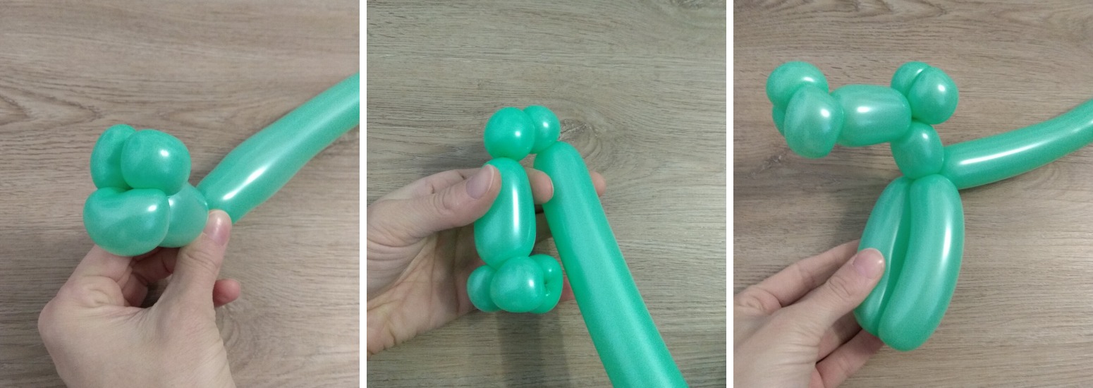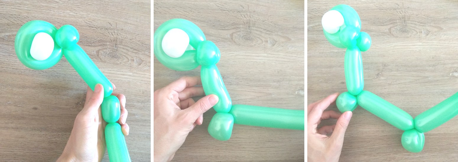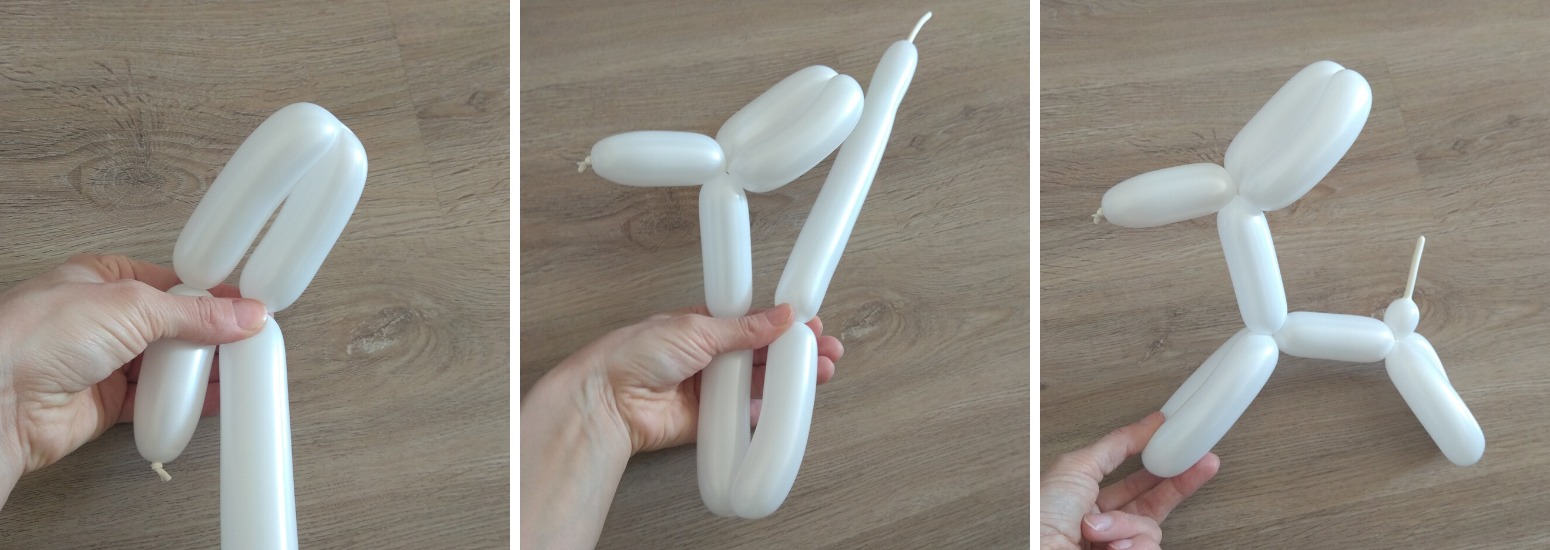 7. Nakonec vytvoříme tělo a zadní nohy. Ze zbytku balónku s nedofouklým koncem bude ocásek. Vzduch z balónku zmáčknutím posuneme na konec, aby vznikla chocholka na konci ocásku