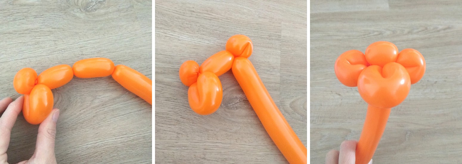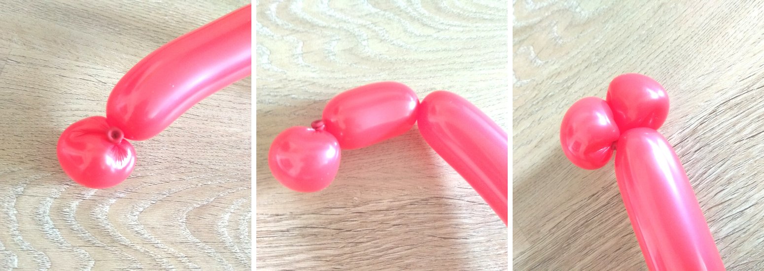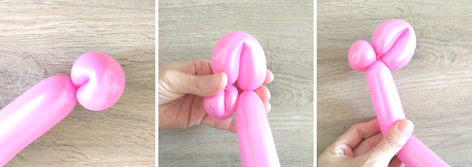 2. Asi 6cm od konce zatočíme, trochu ohneme a podvážeme koncem balónku, to bude tlamička. Z dalších 2 dílků, asi 5 cm dlouhých, vytvoříme zatočením balonku nozdry a stočíme k sobě.
