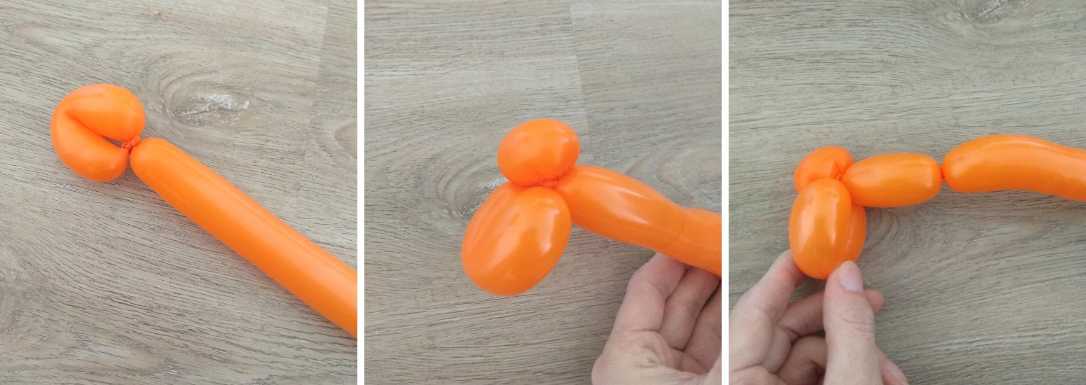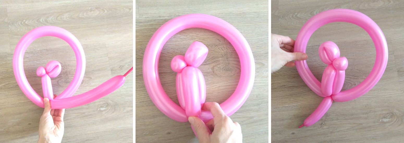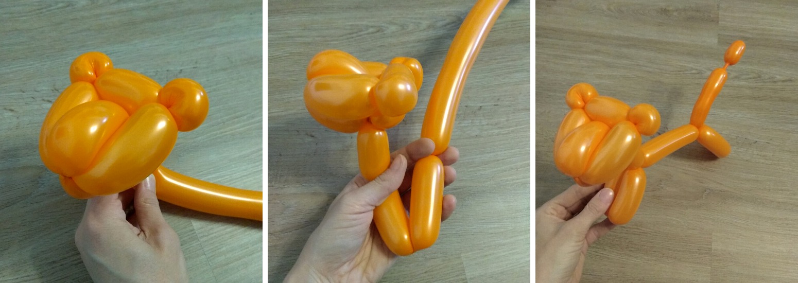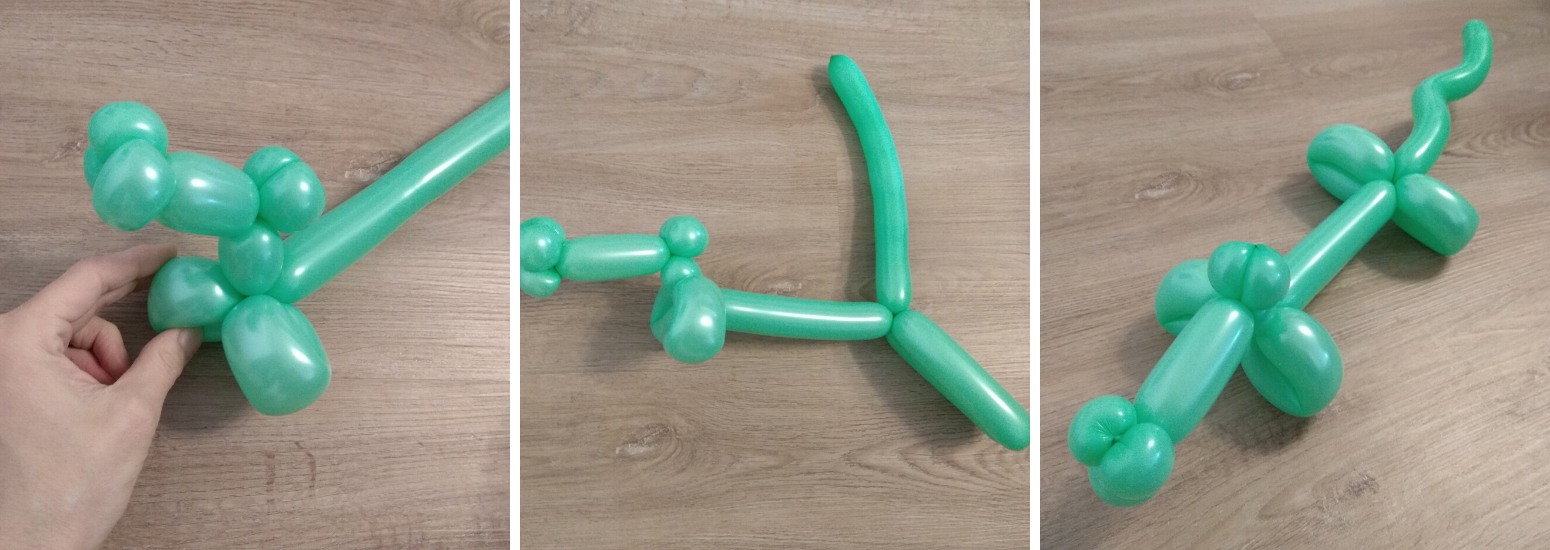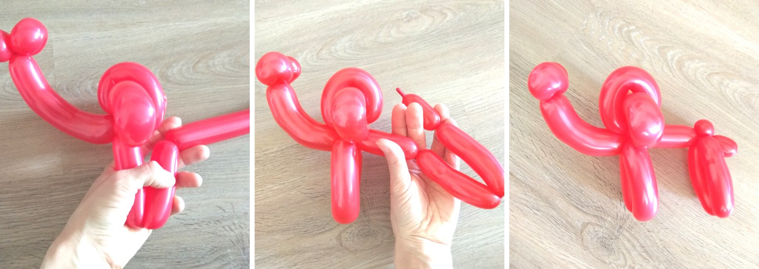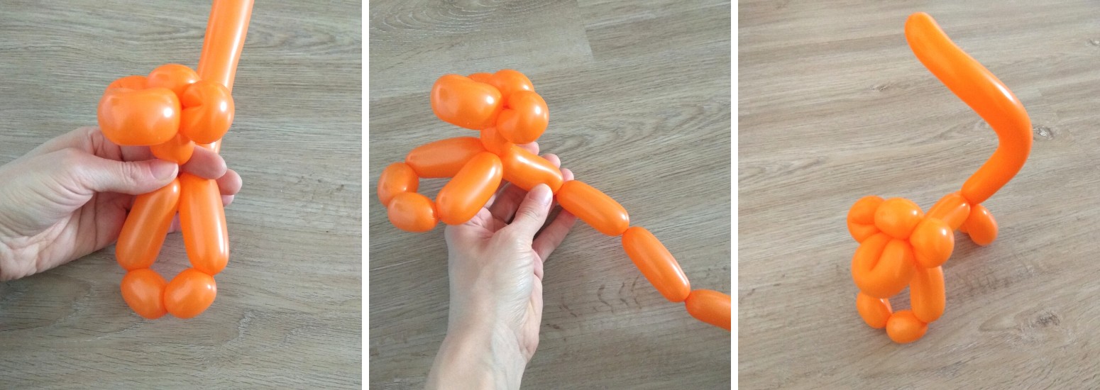 4. Nakonec vytvoříme tělo a zadní nohy. Z malého kousku balonku a cancourku na konci bude ocásek.