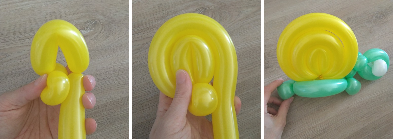 8. Ze žlutého balonku uděláme na konci 2 krátké dílky, které spojíme k sobě jako základ ulitky.