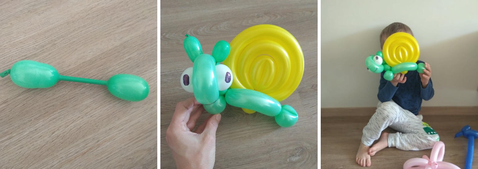 1. Nafoukneme si kousek bílého balónku na oči, zelený balónek na tělo, žlutý balónek na ulitu a ještě kousek zeleného balónku na tykadla.