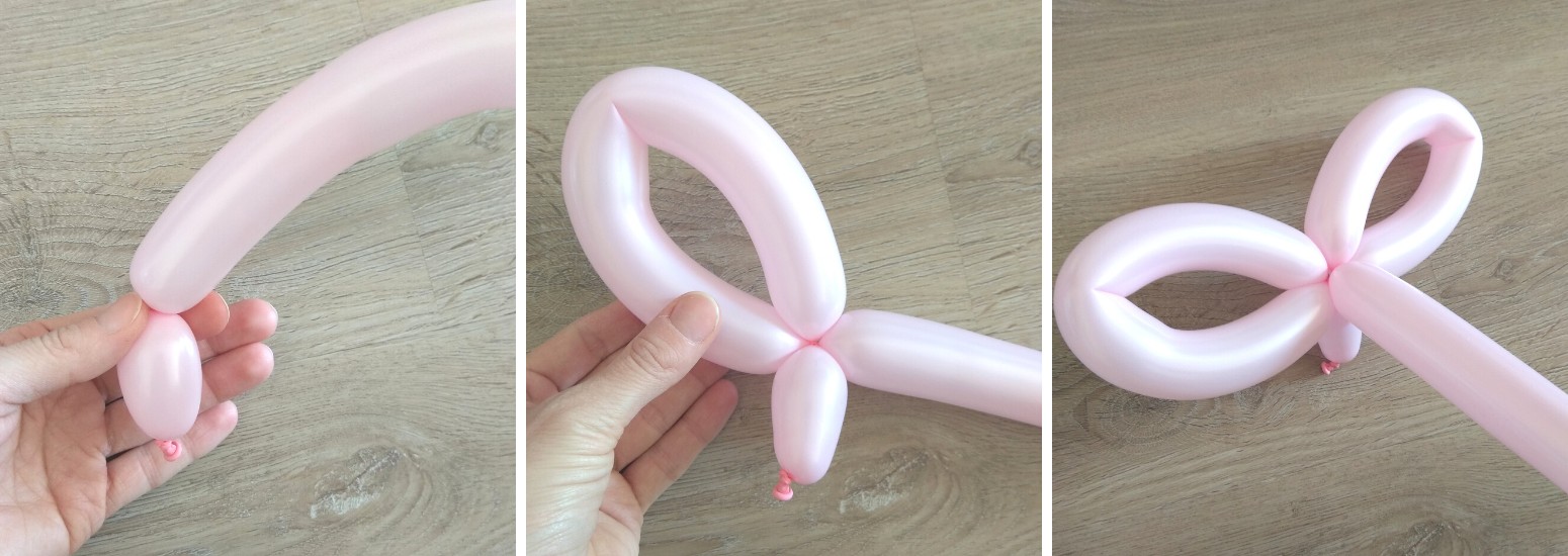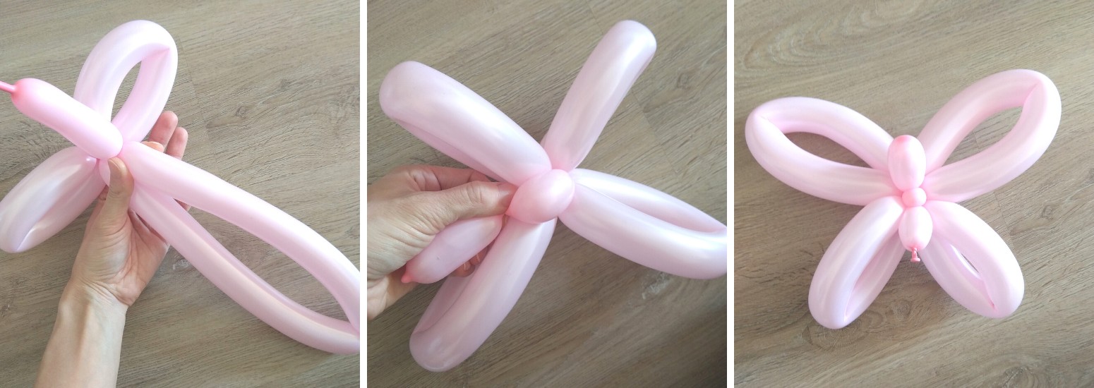 4. Z dlouhého zbytku balonku si u konce necháme část na tělíčko a hlavičku, zbytek přehneme a zatočíme v polovině a horní křidýlka spojíme u tělíčka.