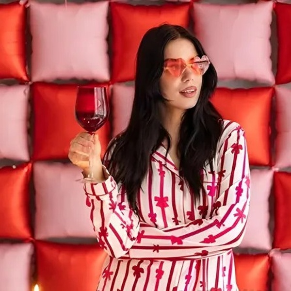 Brýle jsou vyrobené z plastu, ve tvaru červených srdcí a jejich obroučky jsou zlaté a černé, což jim dodává výjimečnou eleganci.