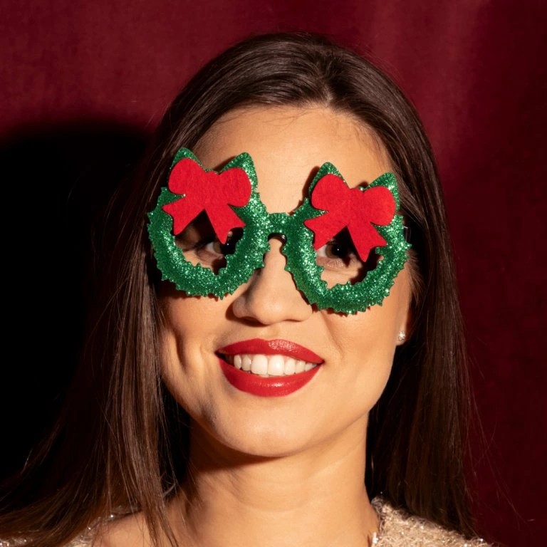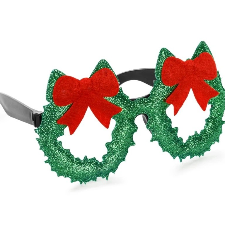 Originální a slušivé brýle jsou ve tvaru vánočního věnce s červenou mašlí