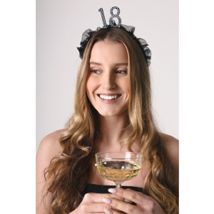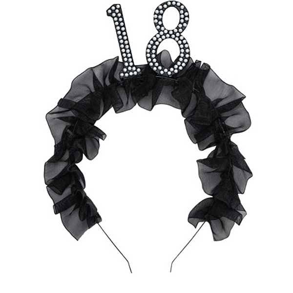 Fantastická čelenka s černým látkovým volánkem a číslicí 18, zdobená perličkami.