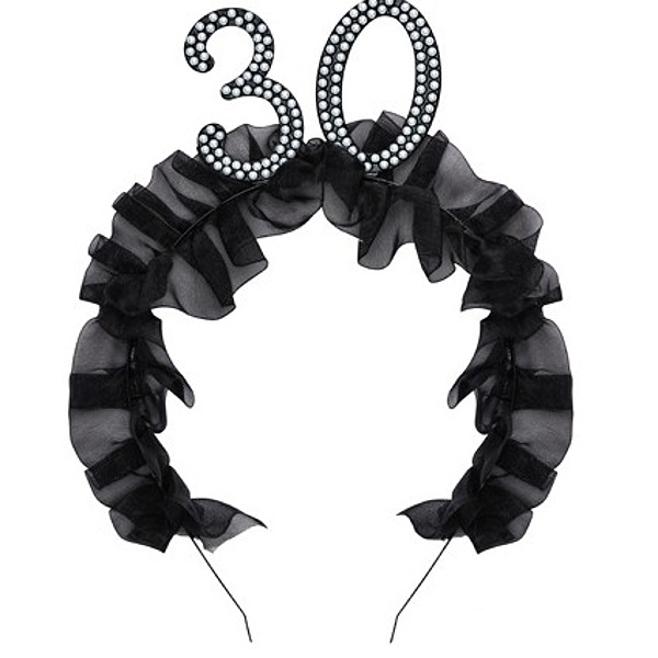 Fantastická čelenka s černým látkovým volánkem a číslicí 30, zdobená perličkami.