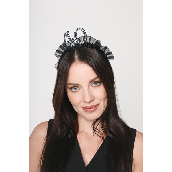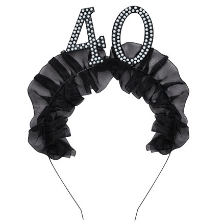 Fantastická čelenka s černým látkovým volánkem a číslicí 40, zdobená perličkami.