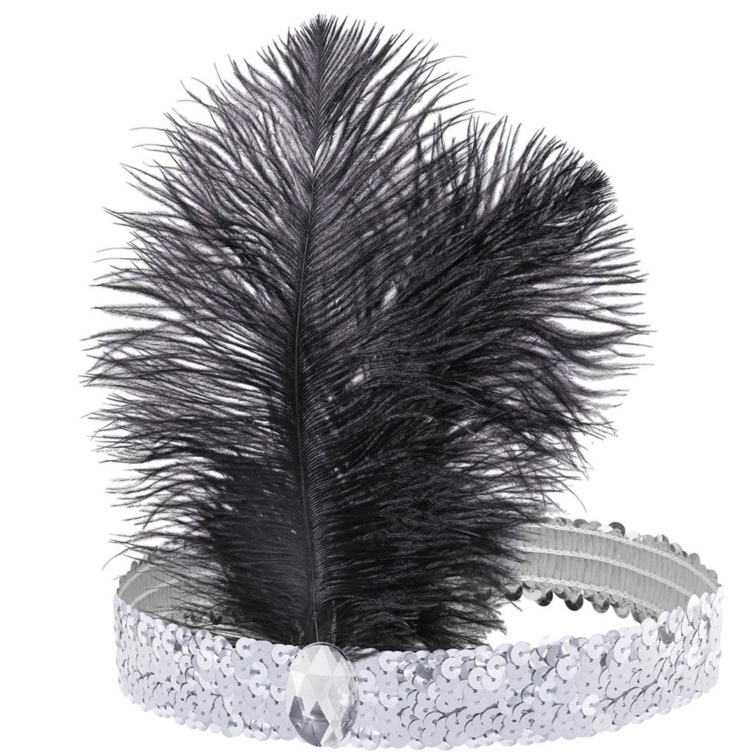 Stříbrný, třpytivý pásek ozdobený flitry okamžitě přitáhne pozornost, zatímco černé peří dodá celému outfitu nádech kabaretu a elegance.