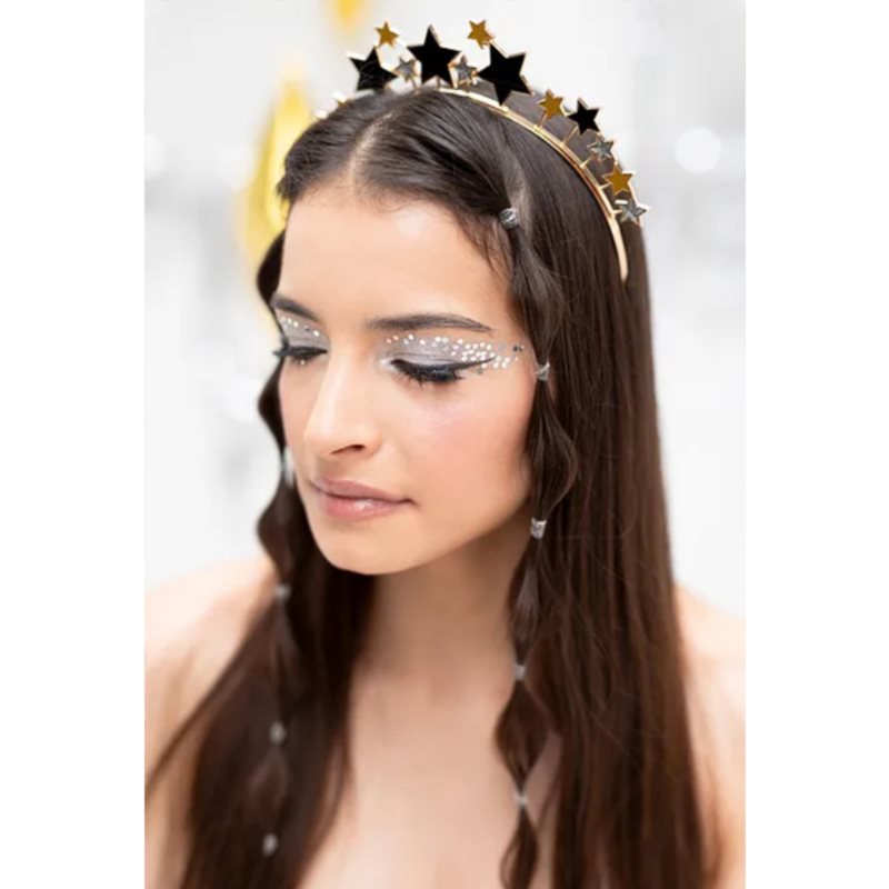 Dámská čelenka s hvězdičkami v barvě černé, zlaté a stříbrné.