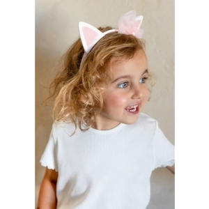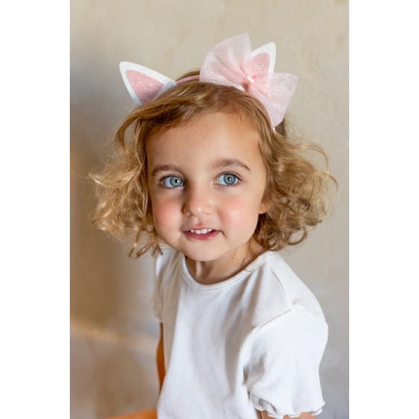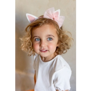 Čelenka je zdobená růžovými kočíčími oušky, jedno z nich ještě zdobí růžová mašlička.