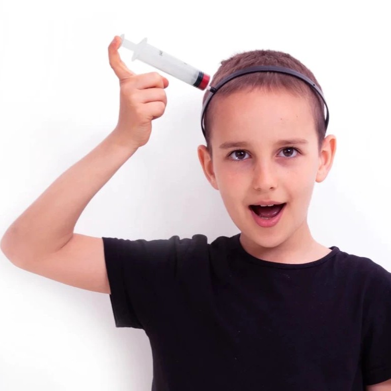 Tato čelenka s připojenou inječní stříkačkou s krví každého na první pohled vyděsí.
