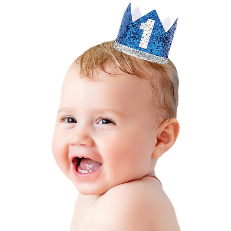 Korunka je zdobená stříbrnými a modrými flitry a je fantastický dárek pro malého ročního oslavence.
