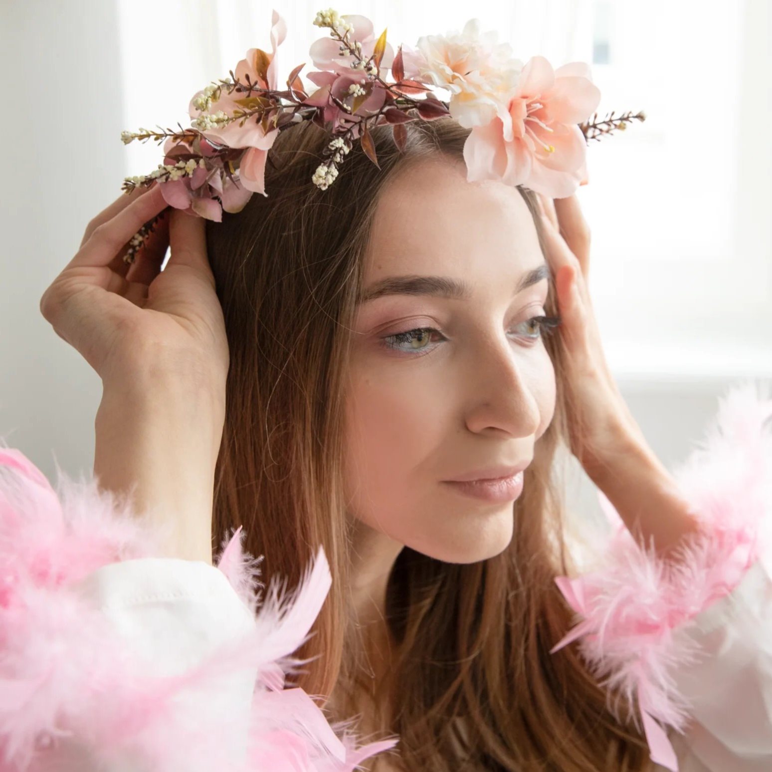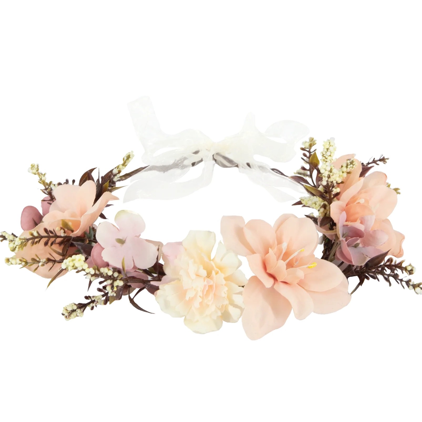 Tento nádherný věneček je ozdobený květy v odstínech broskvové, růžové a ecru, což vytváří harmonickou barevnou kombinaci ideální na svatby, rozlučky se svobodou, letní oslavy nebo focení.