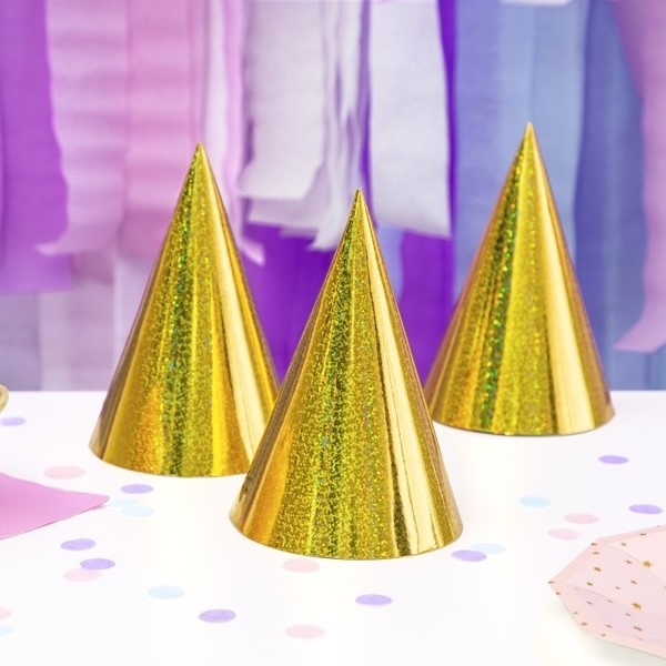 | Zlaté holografické párty čepičky jsou vhodné na oslavy narozenin, výročí zlaté svatby, rozlučku se svobodou nebo tématickou … |