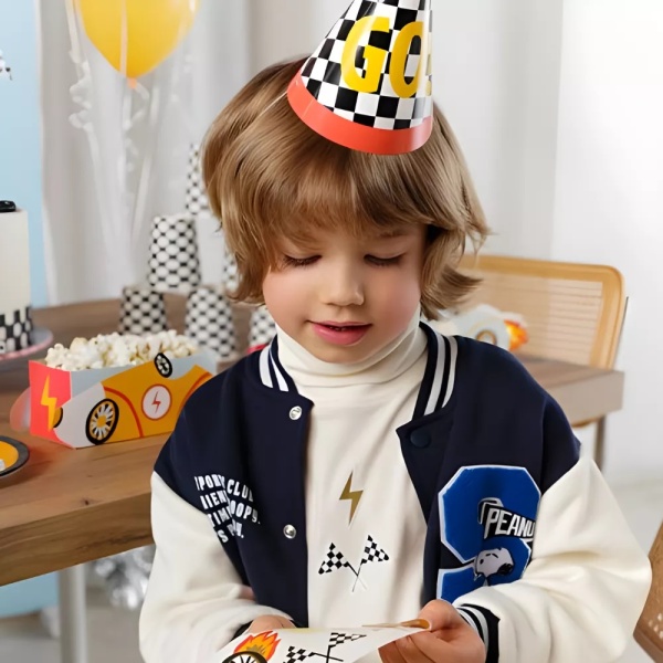 | Sada papírových párty čepiček GO! pro malé obdivovatele závodních aut. Čepičky jsou s šachovnicovým motivem a nápisem … |