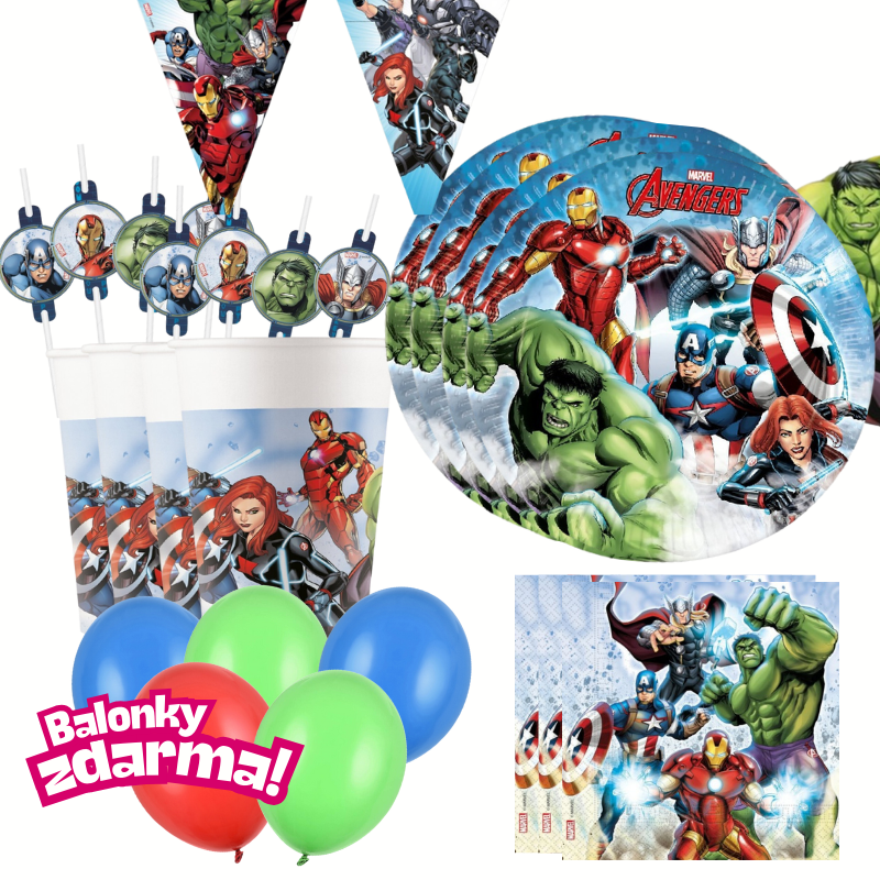 Seberte všechny superhrdiny na oslavu s Avengers party setem! V setu najdete 6 ks talířků, 6 ks kelímků, 20 ks ubrousků, 6 tematických brček, party girlandu, ubrus a 5 balonků zdarma.
