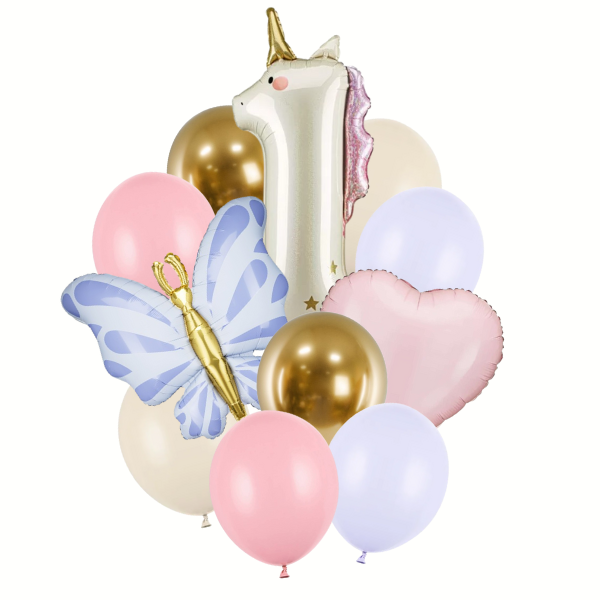 Kouzelný pastelový balónkový buket s motivem jednorožce a číslem 1, ideální pro oslavu pátých narozenin! Jemné barvy v kombinaci s pohádkovými tvary vytvoří nádhernou dekoraci i nezapomenutelný dárek pro malé oslavence.
