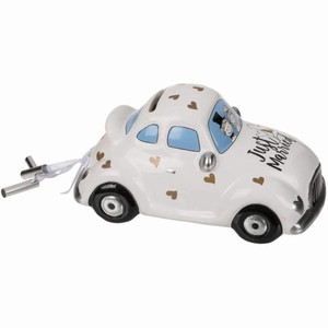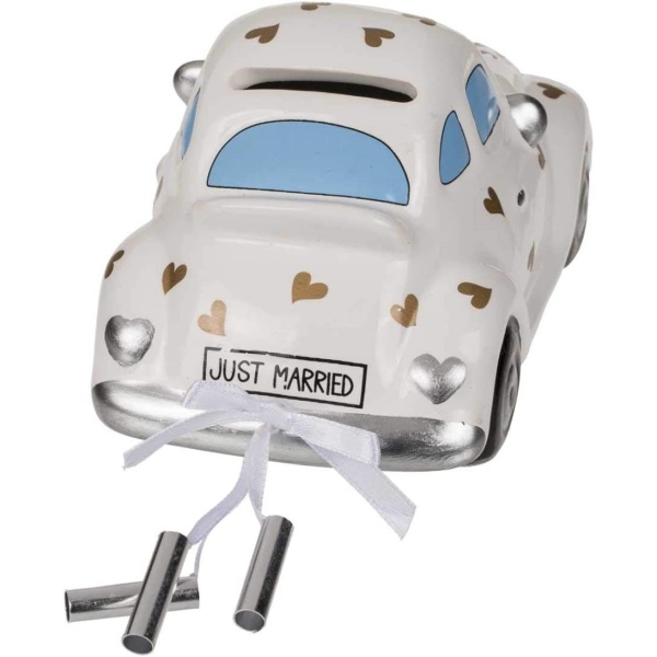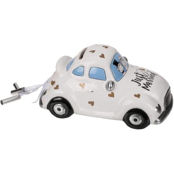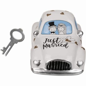 Krásná a originální pokladnička se zámkem v podobě svatebního auta s novomanželi a nápisem Just married