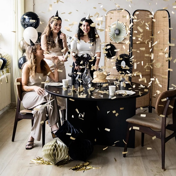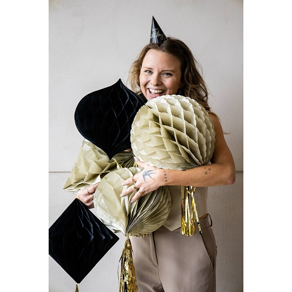 Tyto elegantní závěsné dekorace jsou vyrobené z papíru s fóliovými střapci ve spodní části. Plásty jsou černé nebo krémové barvy a jsou dlouhé 30 cm. Atraktivní design se smetanovým, černým a šampaňským zlatem poskytuje elegantní vzhled mezi všemi dekoracemi.
