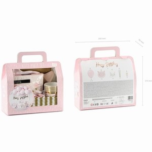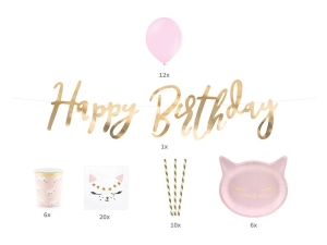 Sada narozeninových párty dekorací Kotě obsahuje: 1x banner s nápisem Happy Birthday, 6 x jednorázové papírové kelímky, 6 x jednorázové papírové talíře, 10 x papírová brčka se zlatými proužky, 20 x papírové ubrousky a 12 ks jednobarevných světle růžových latexových balónků.