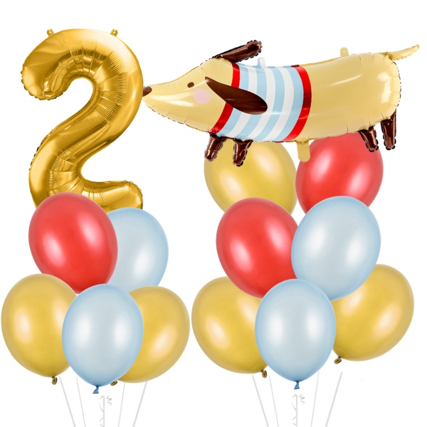 Veselý narozeninový set s jezevčíkem v pruhovaném triku, zlatou číslicí 2 a mixem 12 balonků v barvách zlatá, modrá a červená. Ideální pro malou oslavu s velkou radostí!