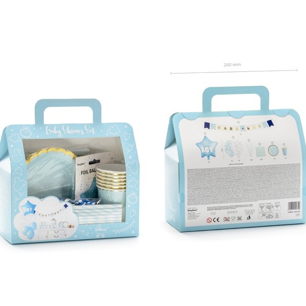 1x Baby boy banner, 1x fóliový balónek ve tvaru modré hvězdy, 6x modré kelímky se zlatým okrajem, 6x modré talíře se zlatým okrajem, 20 x papírové modré ubrousky, 10 x papírová pruhovaná brčka a 5x latexové balónky mix s puntíky a mráčky.