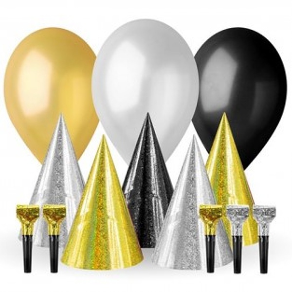 Obsahuje 3 latexové balónky ve zlaté, černé a stříbrné barvě, 5 papírových klobouků a 5 trubek, všechny s velkolepým holografickým povrchem. Tato sada je ideální pro různé druhy oslav, jako je karneval, Silvestr, narozeniny nebo výročí.