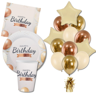 Krásná papírová sada s nápisem Happy Birthday To You, doplněná o balónky ve stejných tónech krémové, měděné, chromové zlaté a alabastru, vám rozhodně nesmí chybět na oslavě elegantních narozenin.