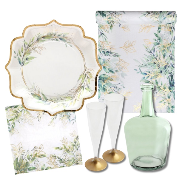Elegantní set v zlatozelených tónech na party nebo oslavu pro 10 osob. Velmí krásný design s krásnou šerpou, talířky, ubrousky i nerozbitnými šampuskami je neutrální volbou a tipem jak jednoduše zajistit kompletní stolování na oslavu narozenin, rozlučku se svobodou, svatební after party nebo promo akci.