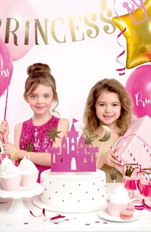 Party set obsahuje banner s nápisem "Princess", 6 ozdobných zápichů na cupcakes, ozdoba na dort (4ks), 10 brček, 6 balónků, fóliový balónek zlatá hvězda, konfety na stůl, růžovou holografickou serpentýnu a saténovou stuhu