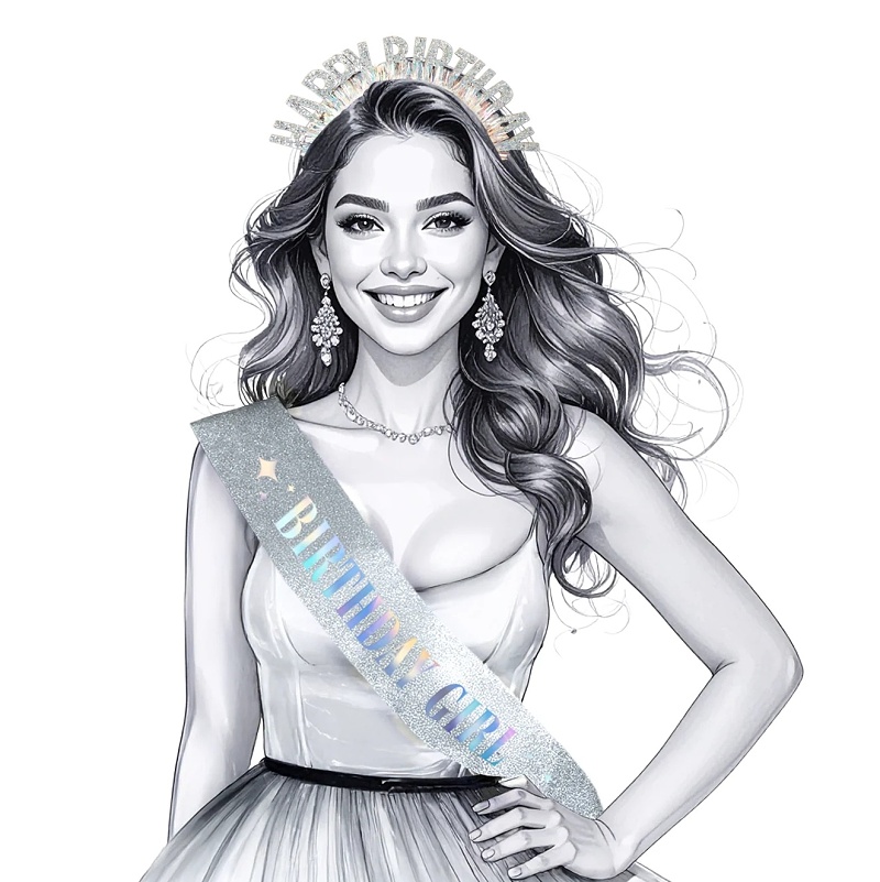 Párty sada šerpa a čelenka Happy Birthday stříbrná je jemný, ale výrazný doplněk narozeninové oslavy, díky kterému se oslavenkyně okamžitě stane středem pozornosti. Elegantní stříbrná barva a nápis Happy Birthday vytvářejí slavnostní efekt na fotkách i při příchodu hostů, ať už jde o menší rodinnou oslavu, dámskou párty.