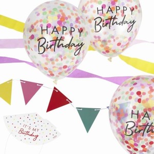 1 x vlaječkovou girlandu, 1 x párty papírový klobouček, 3 x konfetové balónky, 3 x krepové role.