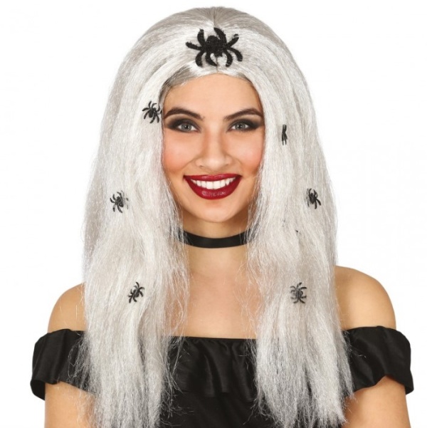 Paruka je šedé barvy s pěšinkou uprostřed, na které vévodí ten největší pavouk.
