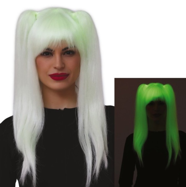 Blond paruka s krásnými dlouhými, ve tmě zářícími vlasy.