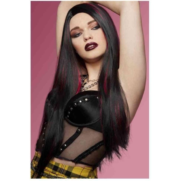 Paruka Vampires Kiss má dlouhé černé vlasy s červenými pramínky.