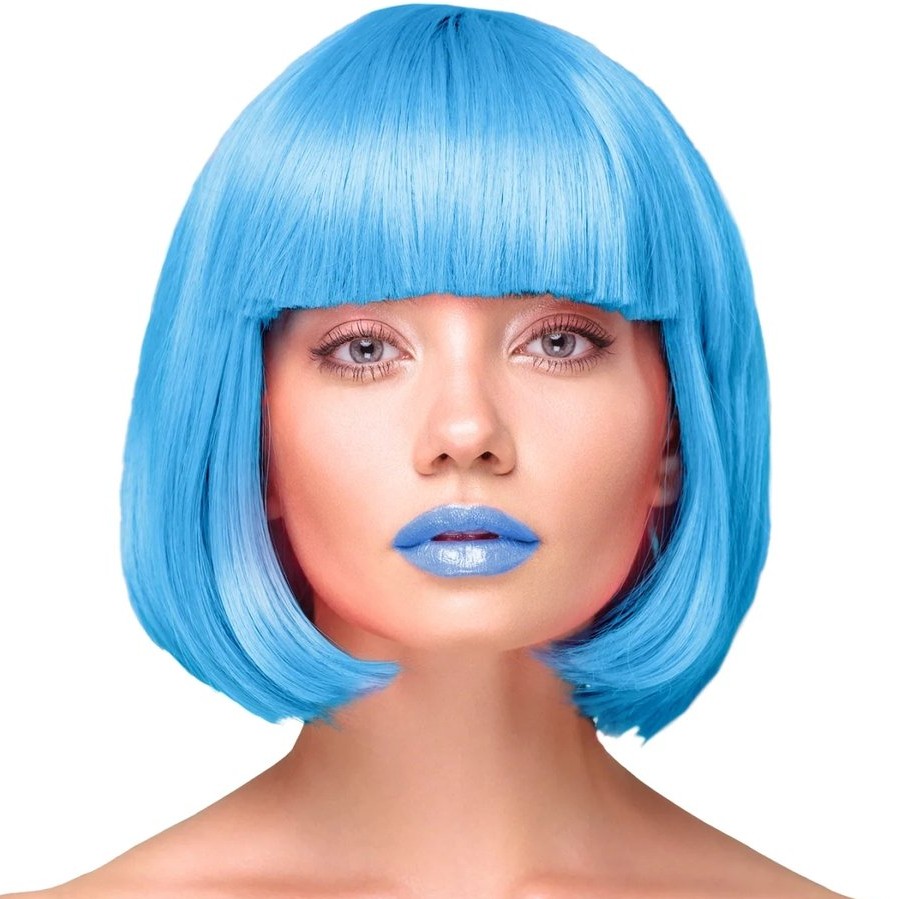 Dámská paruka s krátkými modrými vlasy s ofinou dodá vašemu outfitu barevný akcent.