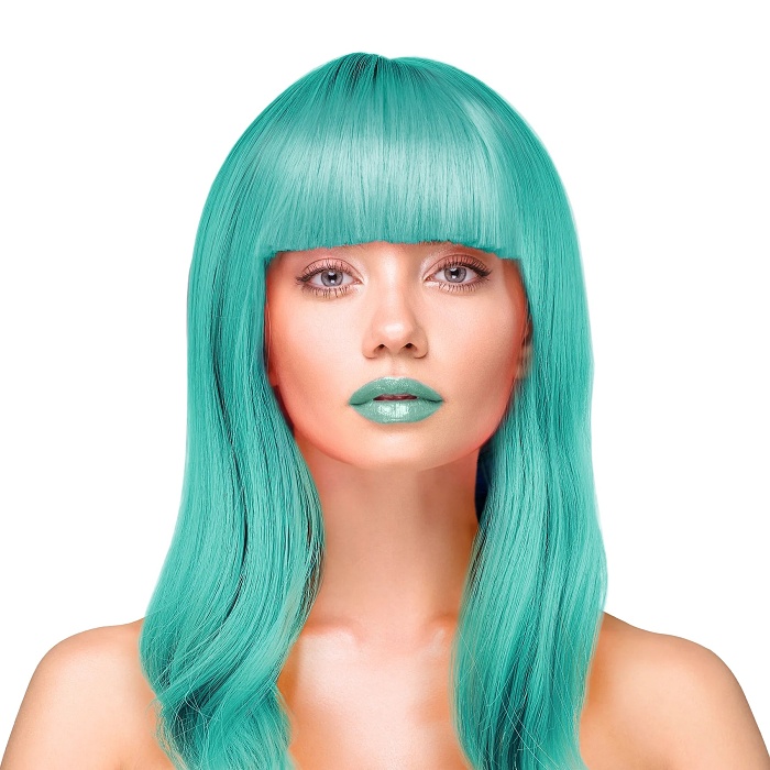 Dámská paruka s dlouhými rovnými tyrkysovými vlasy a ofinou