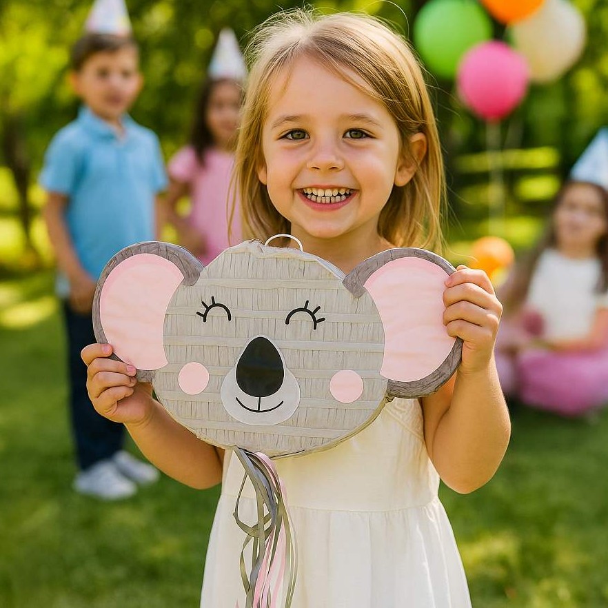 Piñata ve tvaru hlavy koaly je určená k naplnění dárky, drobnostmi nebo sladkostmi.
