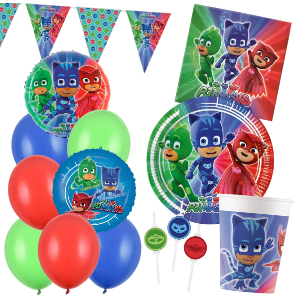 Set obsahuje: 2 latexové balónky červené (30 cm), 2 latexové balónky pastelově modré (30 cm), 2 latexové balónky zelené jablko (30 cm), 8 papírových kelímků PJ Masks (200 ml), 1 fóliový kulatý balónek PJ Masks (61 cm), ubrousky PJ Masks, vlaječkový banner PJ Masks (2,3 m), 8 papírových brček PJ Masks, 1 fóliový balónek PJ Masks (46 cm) a 8 papírových talířů PJ Masks (23 cm).