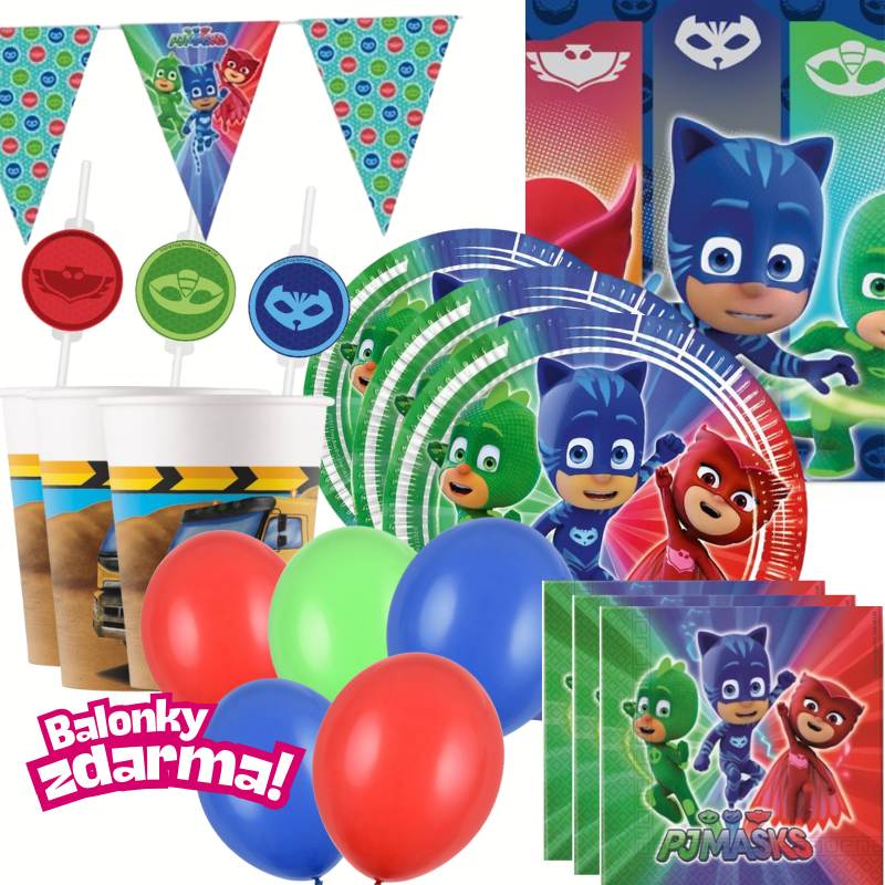 Proměňte děti ve skutečné hrdiny s PJ Masks party setem! Balení obsahuje 8 ks talířků, 8 ks kelímků, 20 ks ubrousků, 8 tematických brček, party girlandu, ubrus a jako bonus 5 balonků zdarma. Rychlý výběr, skvělá cena a možnost dokoupení tematických hraček či dárků pro fanoušky nočních dobrodružství!