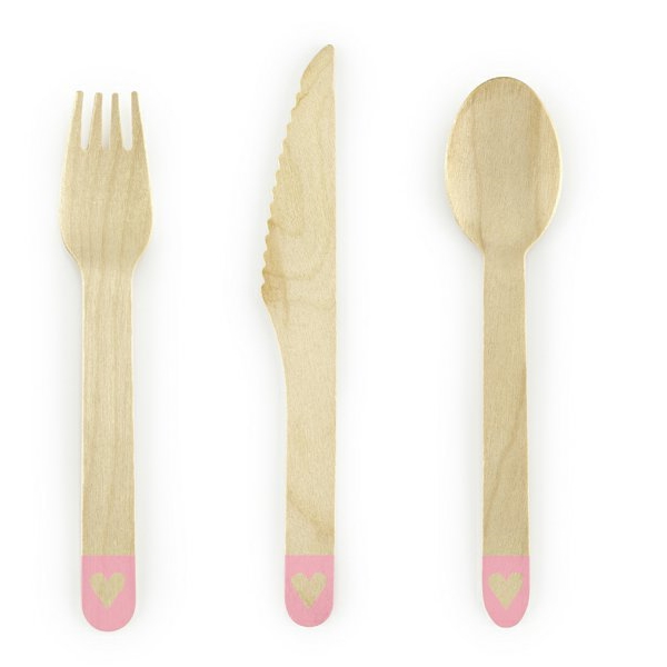 Krásný designově zajímavý set pro stolování. Příbory jsou v barvě přírodního dřeva se světle růžovým zabarvením a ornamentem srdíčka.