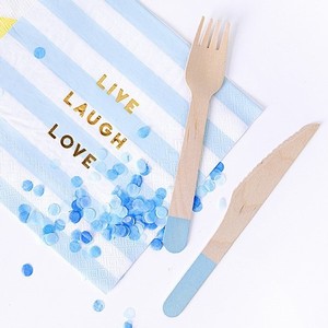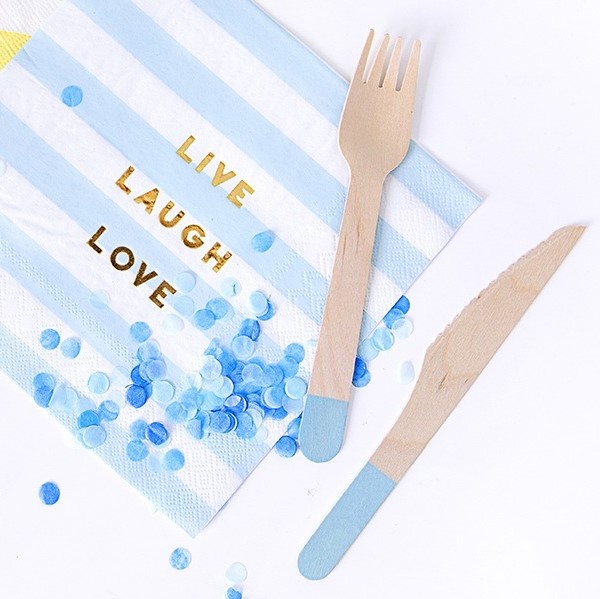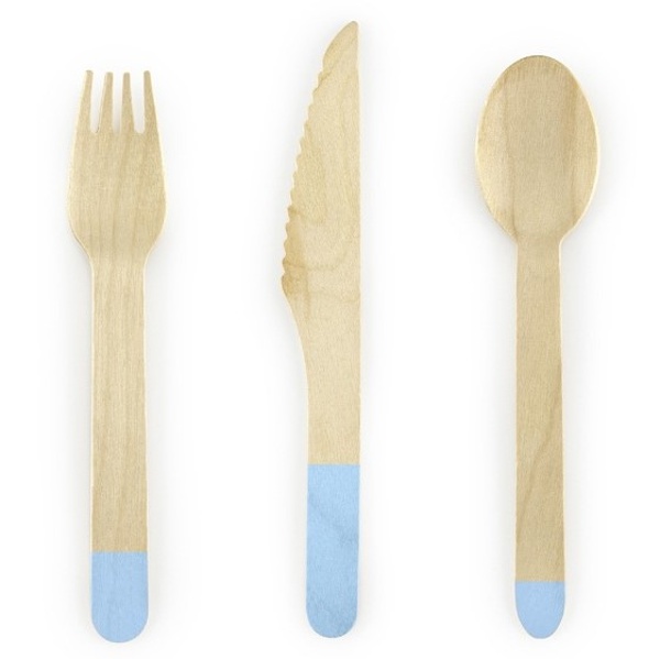 Příbory jsou v barvě přírodního dřeva se světle modrým zabarvením.
