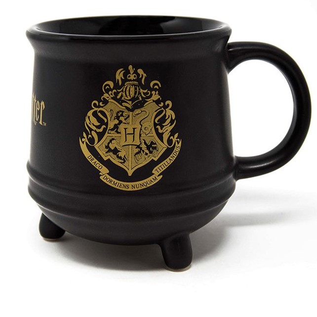 Keramický černý hrnek v podobě kouzelnického kotlíku a s erbem Bradavic, školy čar a kouzel v příbězích o Harry Potterovi.