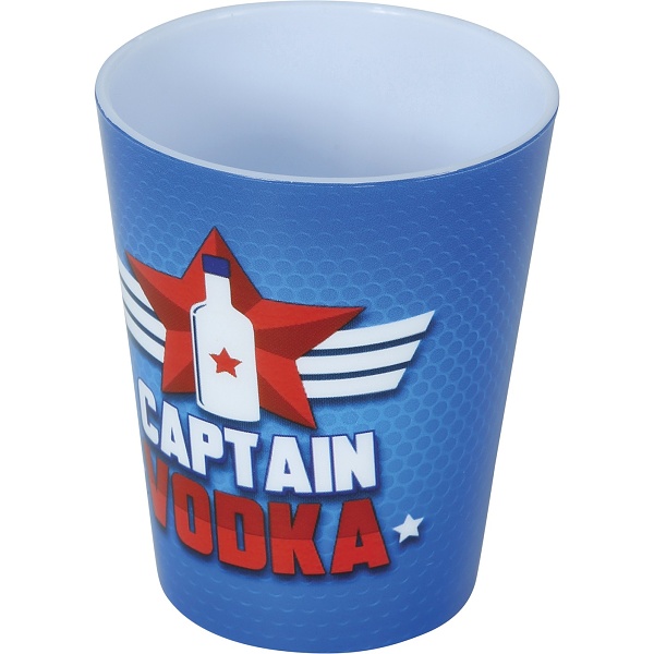Plastové panáky v modré barvě a potiskem Captain Vodka