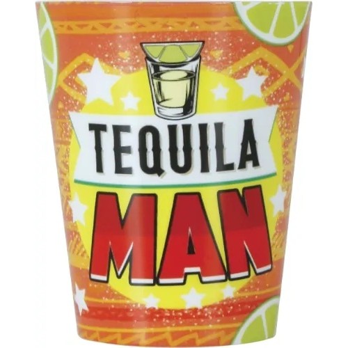 Plastové panáky v modré barvě a potiskem Tequila Man