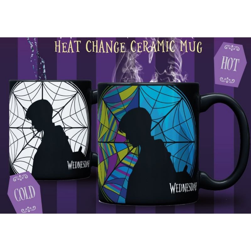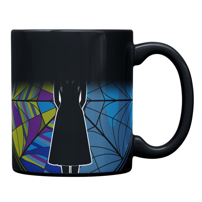 Na hrníčku je dívka Wednesday Addamsová v černé školní uniformě akademie Nevermore. Hrnek je magický a po nalití horkého nápoje změní barvu/obrázek.