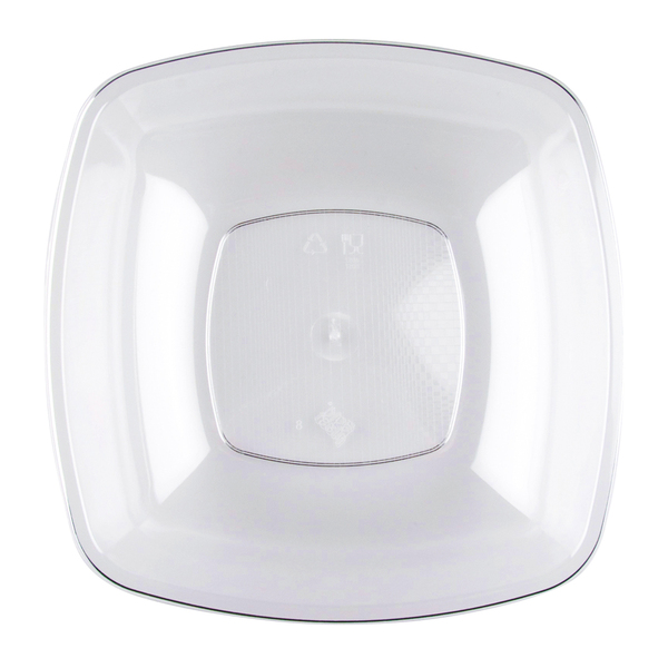 Talíře transparentní jsou plastové, omyvatelné a opakovaně použitelné.