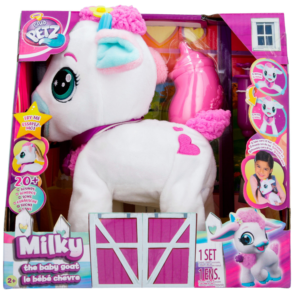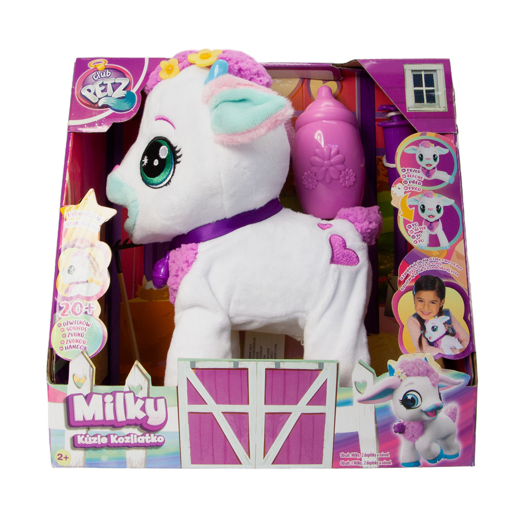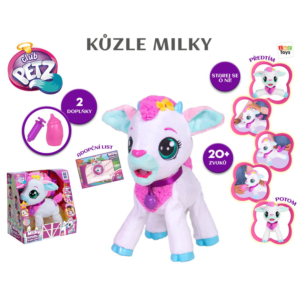 - Interaktivní kůzlátko Milky, Milky vydává až 20 různých zvuků. Hezky se o něj postarej, hlaď ho po hlavě, naočkuj ho, nakrm ho. Ono se postaví na všechny čtyři. Balení obsahuje: 1 plyšáka, 1 lahvičku, 1 injekci, 1 letáček, 1 návod.