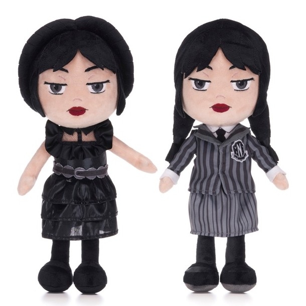 Plyšové panenky Wednesday Addams představují postavu ve dvou jejích ikonických oblecích.