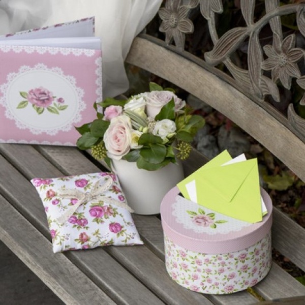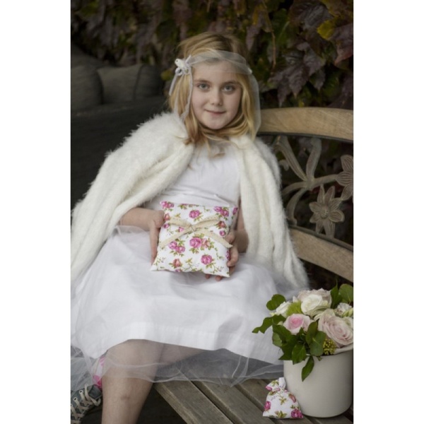 Polštářek na snubní prstýnky s květinami a bavlněnou stužkou.